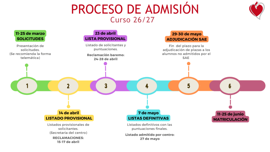 Se inicia el plazo de admisión de alumnos para el curso escolar 2026-2027. El plazo de presentación de solicitudes será del 11 al 25 de marzo de 2026, ambas fechas inclusive. Estas son las fechas más relevantes de los distintos pasos del proceso de admisión: